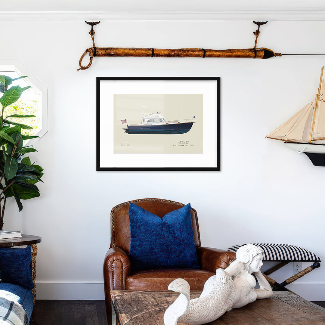 Bring your boat home for the off-season — beautifully illustrated and framed with care.