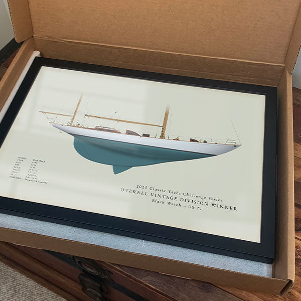 At Dogwatch Art Co., authenticity matters. We'll create a highly detailed, gallery-quality, illustrated print of your boat, meticulously designed to your exact specifications, framed and shipped to you in days. Add your club burgee, yacht name, caption, crew signatures, and more.