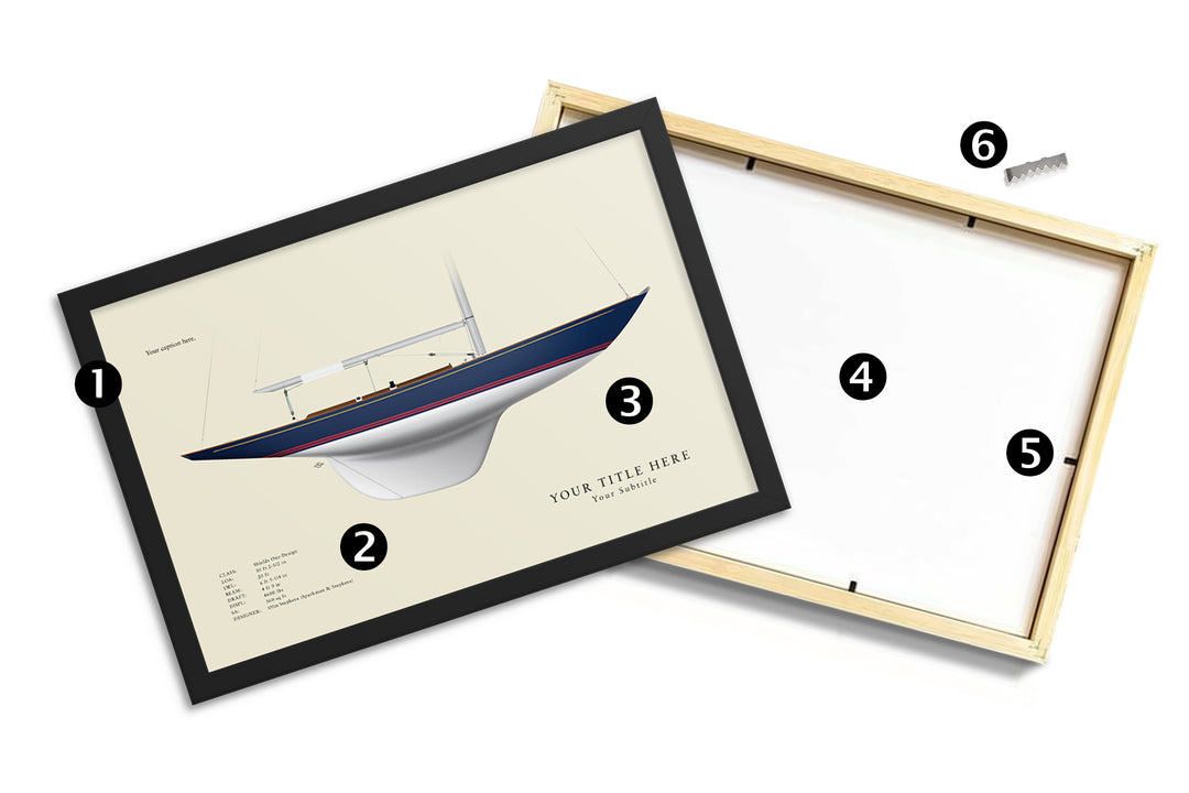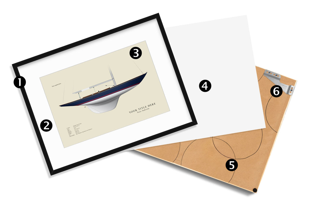 Inspired by traditional half hull models, we draw boats in perfect profile from the starboard side in either our Flush Deck or With Deck Details style. We offer several ways for you to enjoy your print: unframed, our standard frame, or our premium gallery frame. Each print features a level of detail that you simply won't find anywhere else on the internet right down to the smallest padeye.
