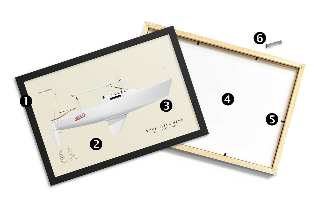 Our standard frame features a solid wood moulding with a clear, lightweight acrylic glazing. Your print is placed within the frame (not permanently mounted) and held securely in place, behind the glazing, with a rigid backing board and metal retaining clips, allowing the artwork to be displayed cleanly without adhesives or mounting materials. The frame arrives with a sawtooth hanger included in the package. To install, all you'll need is a light tap with a hammer.